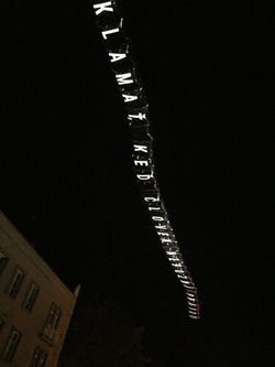 Text and light installation is site-specifically set into the public space - hoveing above it. It represents poetically-political contemplation of the authors on ambiguity of interpretation of the present.