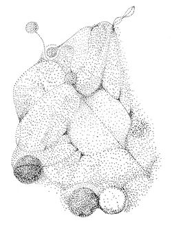 I observe my surroundings for some time, their contours obscured by a strange semi-liquid light-black substance, levitating in a peculiar manner and circling around me slowly. It clusters together into forms resembling thick running paint which tears apart in places, with translucent capillaries occurring along its torn edges. A narrow crevice has formed between me and the revolving substance. The air circulates through it. In my peripheral vision I perceive the flying air particles which seem to be pulsating, breathing in, visibly increasing their volume, then exhaling and vanishing away. When inhaling, they give out high-pitched squeaking sounds, sharply cut off in the moment of expiration. One particle in the lower left arc has not exhaled yet. All the other particles that emerged at approximately the same moment perished long ago. This one stays with the inhalation, changing into an elongated tube covered with hair, out of which rise the flames of a yellowy green substance, reminiscent of claws or oleander leaves. Veins gradually appear on its surface, changing into silver strips within a few seconds.